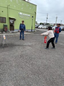 全員の避難後は、消火器の使い方を学び “いざ実践!”